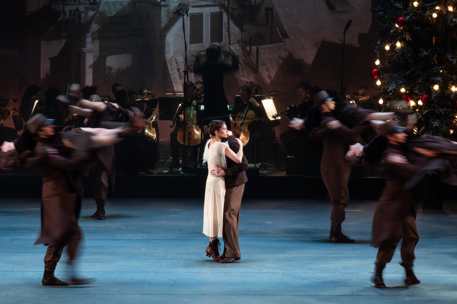 В этом музыкальное решение синхронно с либретто. Но если Антон Торбеев исходил из невозможности или нежелания заказать новую партитуру и необходимости искать интерпретацию существующей, с присущими этому процессу ограничениями, то Павел Глухов и Татьяна Белова получили карт-бланш. Из «Щелкунчика» исчезли крохи привычного сюжета, магия. Осталась суровая реальность. Действие теперь происходит в двух временных пластах — ранневоенном 1914-м и предвоенном 1938-м — и охватывает 24 года. Осталась всем известная девочка Клара, но она теперь влюблена в нового главного героя, Натаниэля. Именно его уже намного повзрослевшим взглядом мы окидываем события декабря 1914-го, когда юноша Натаниэль уже знает о начавшейся войне, но мирная жизнь пока остается в своих правах, а в армию он не призван. Парадоксально, но мотив воспоминания гораздо более явно отражен в музыке. Глухов в «Щелкунчике» хорош в сочинении танцев, но не всегда удачно разводит мизансцены. Из-за этого часть изменений можно заметить не сразу.