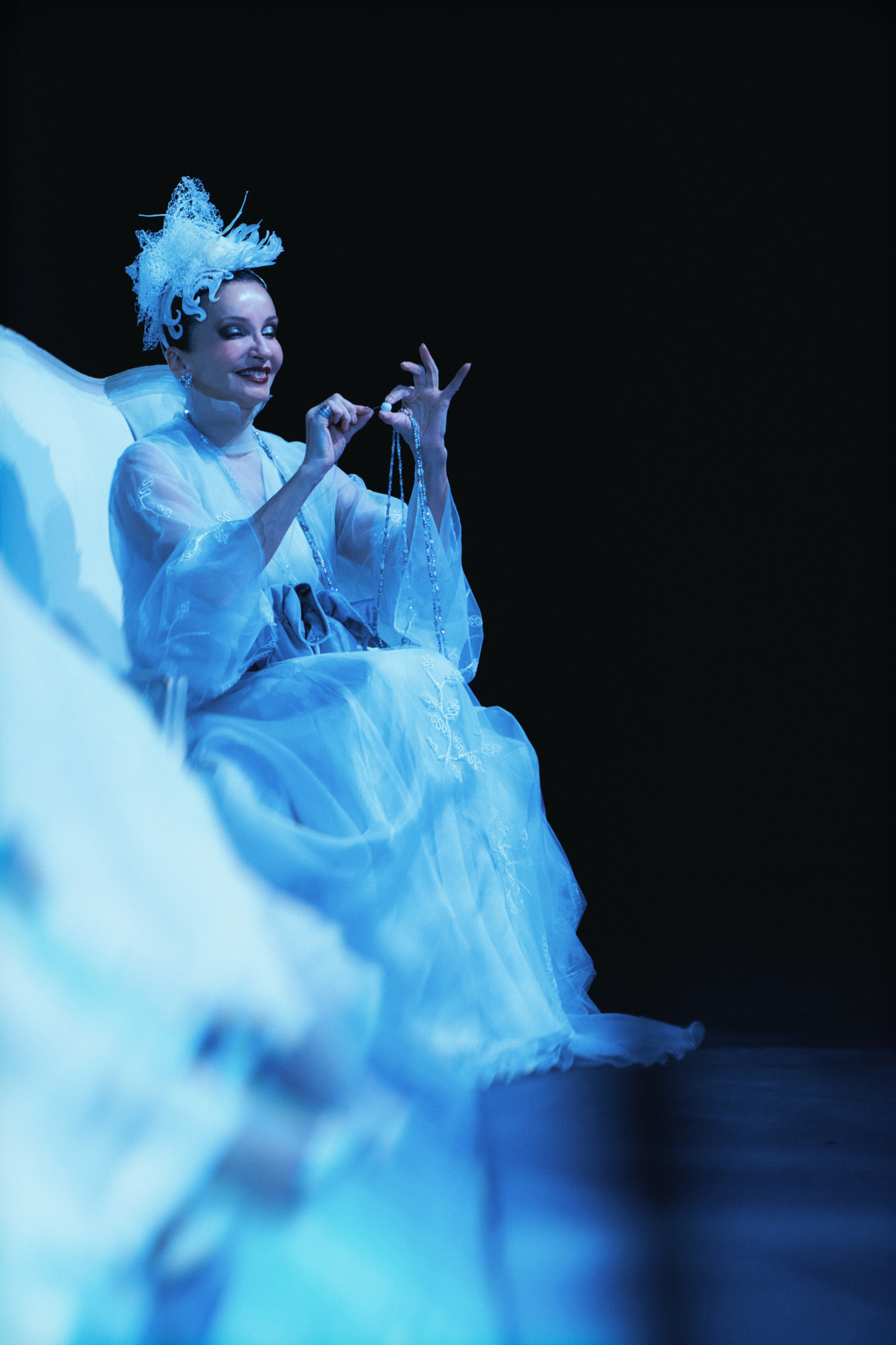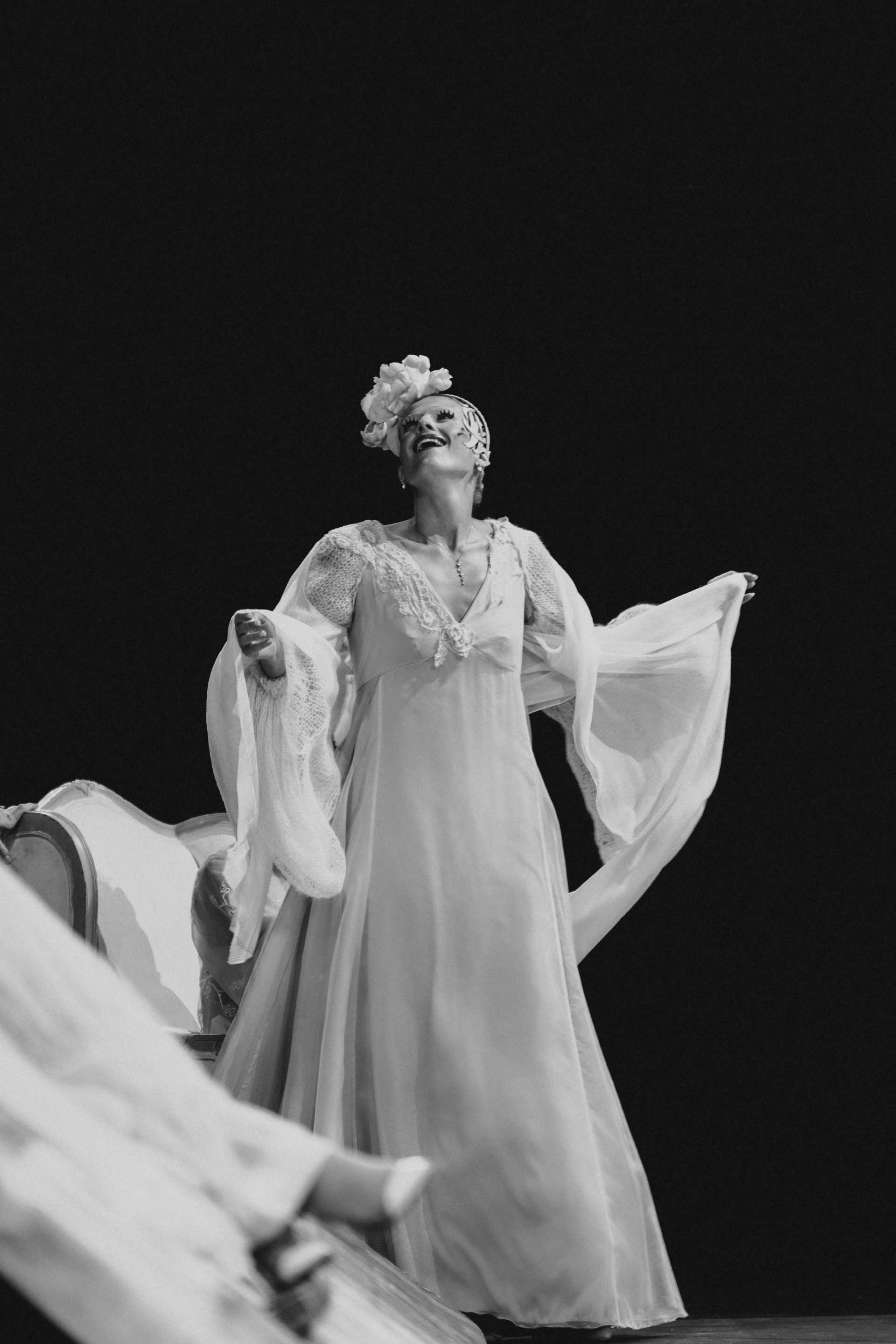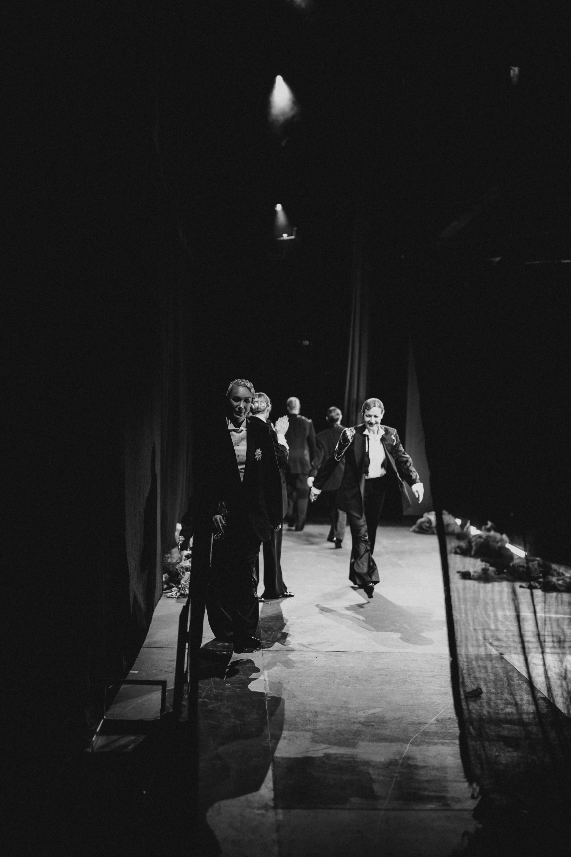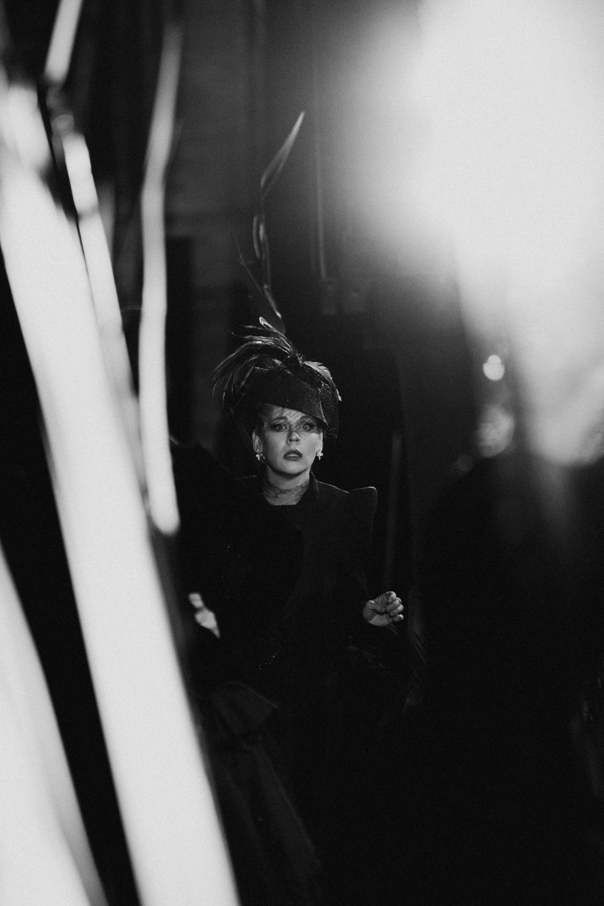 Фотоэссе Алисы Аслановой фиксирует спектакль как особое состояние: мгновения напряжения, застывшие позы, блеск украшений, острые линии тел в движении. Это не просто хроника, а визуальный комментарий к постановке, где театр продолжает жить за пределами сцены — в кадре, в деталях, в отражениях света.