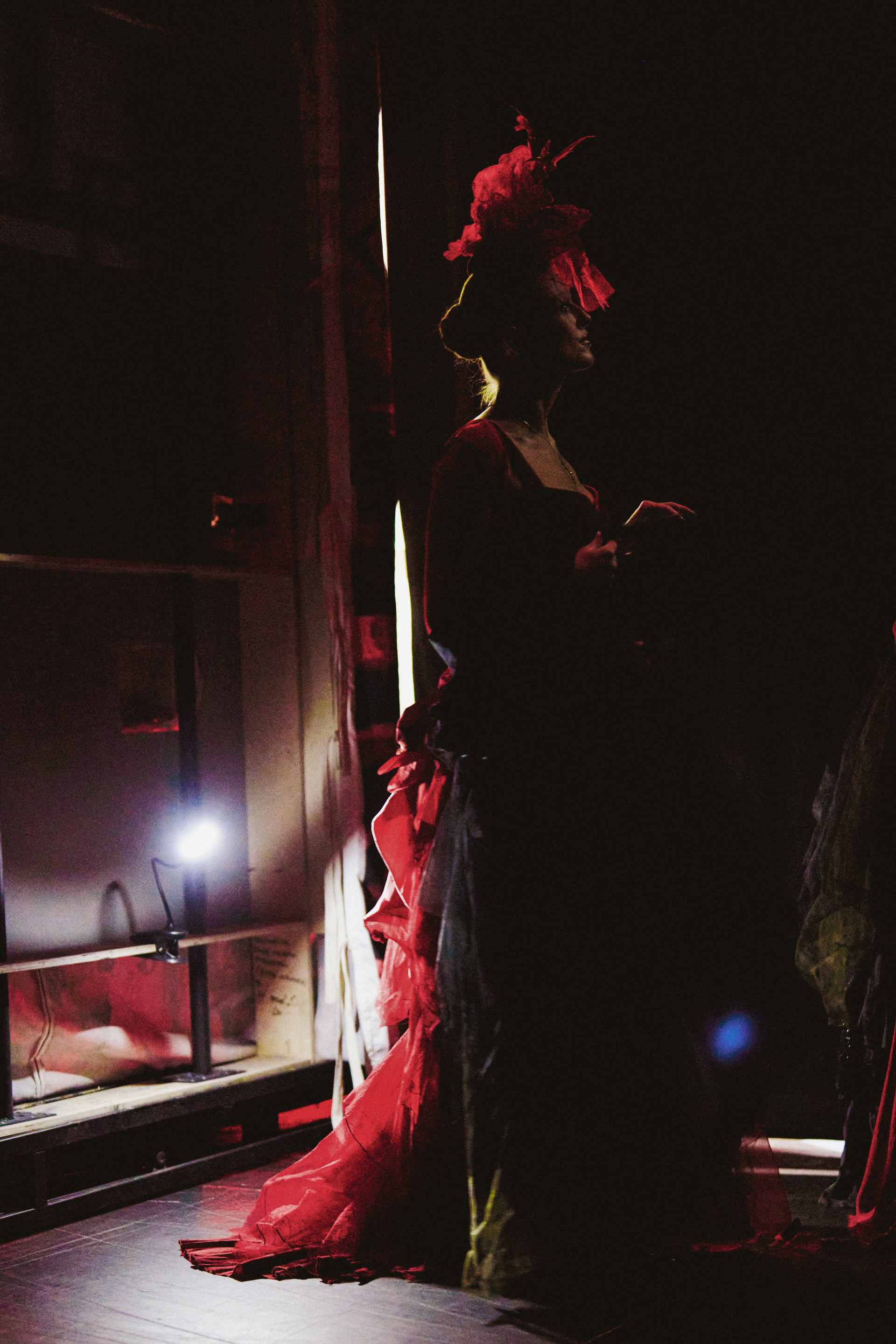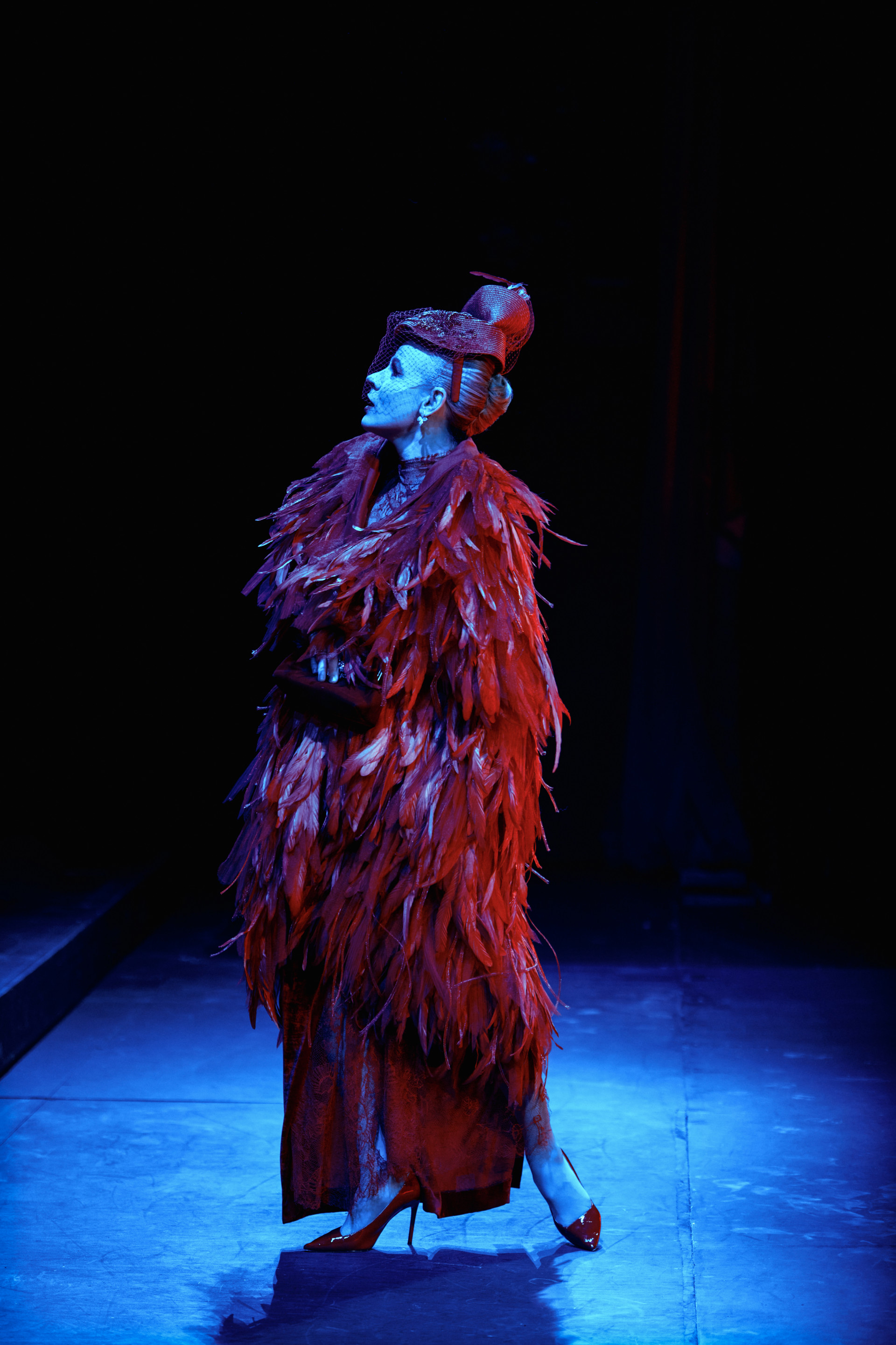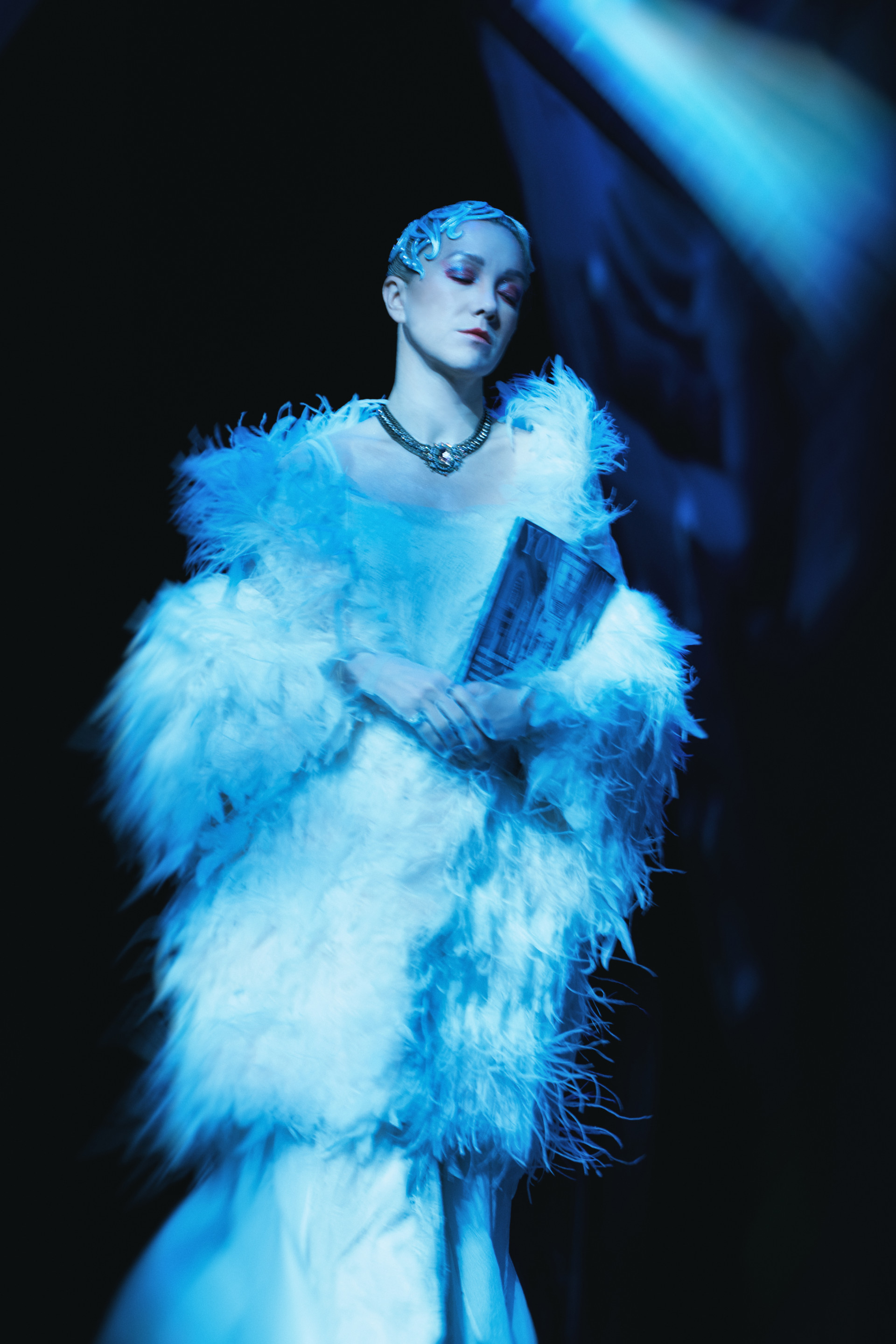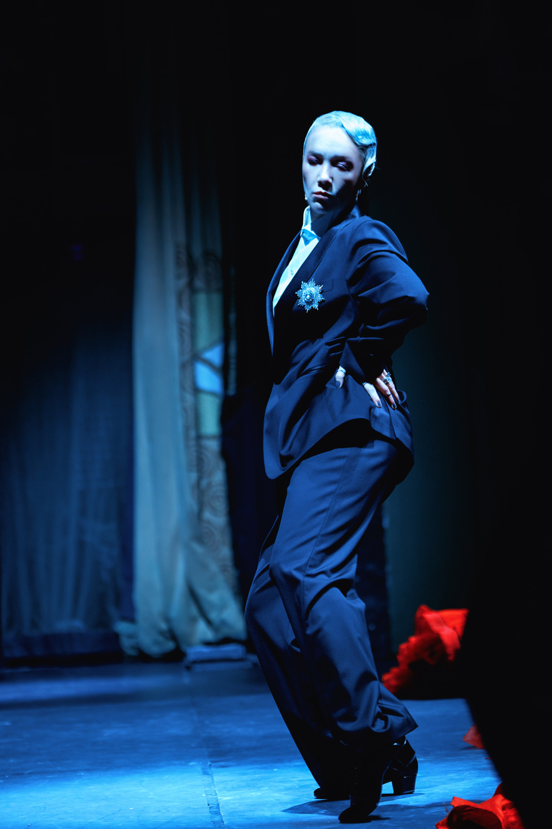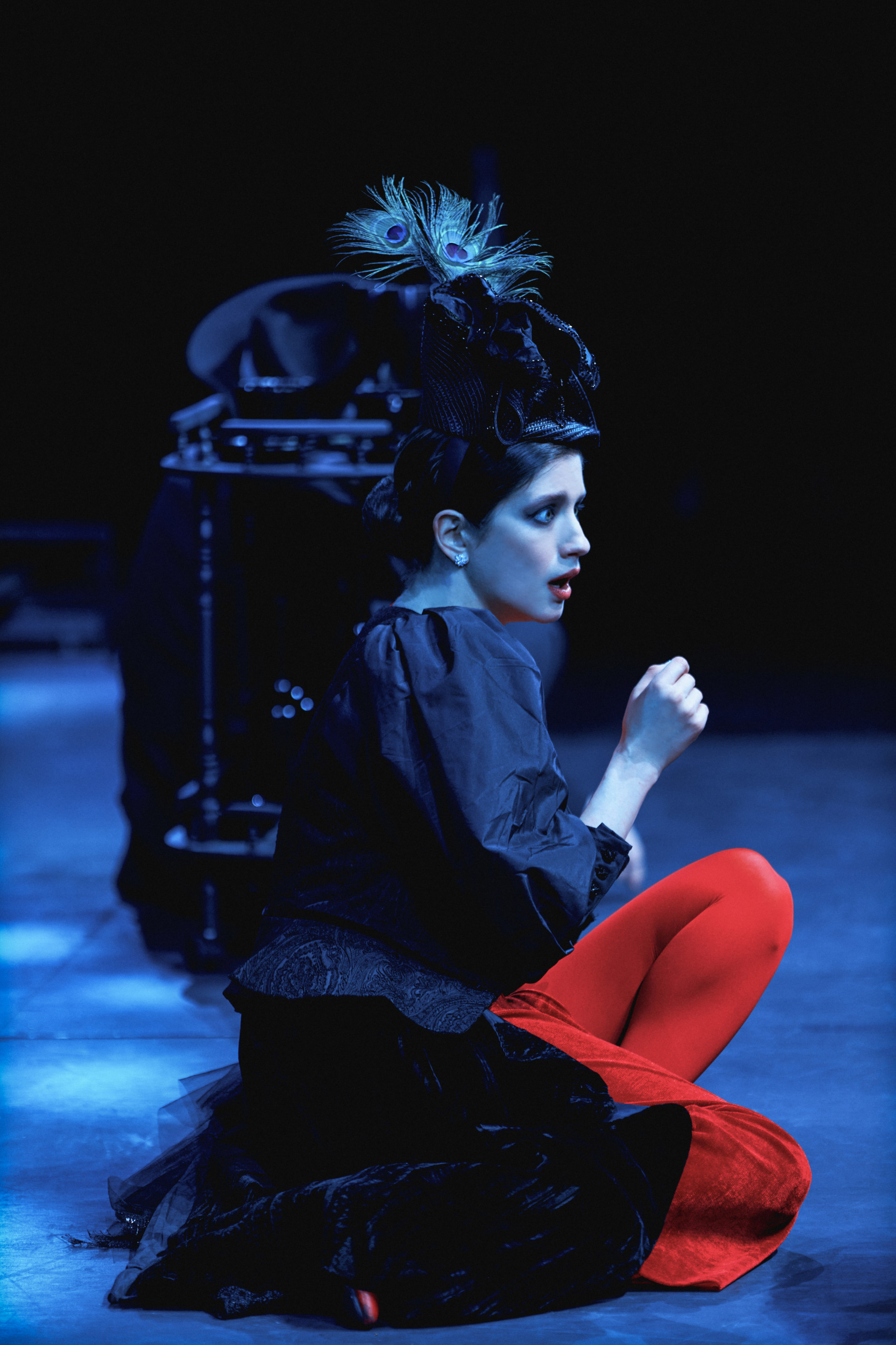 Фотоэссе Алисы Аслановой фиксирует спектакль как особое состояние: мгновения напряжения, застывшие позы, блеск украшений, острые линии тел в движении. Это не просто хроника, а визуальный комментарий к постановке, где театр продолжает жить за пределами сцены — в кадре, в деталях, в отражениях света.