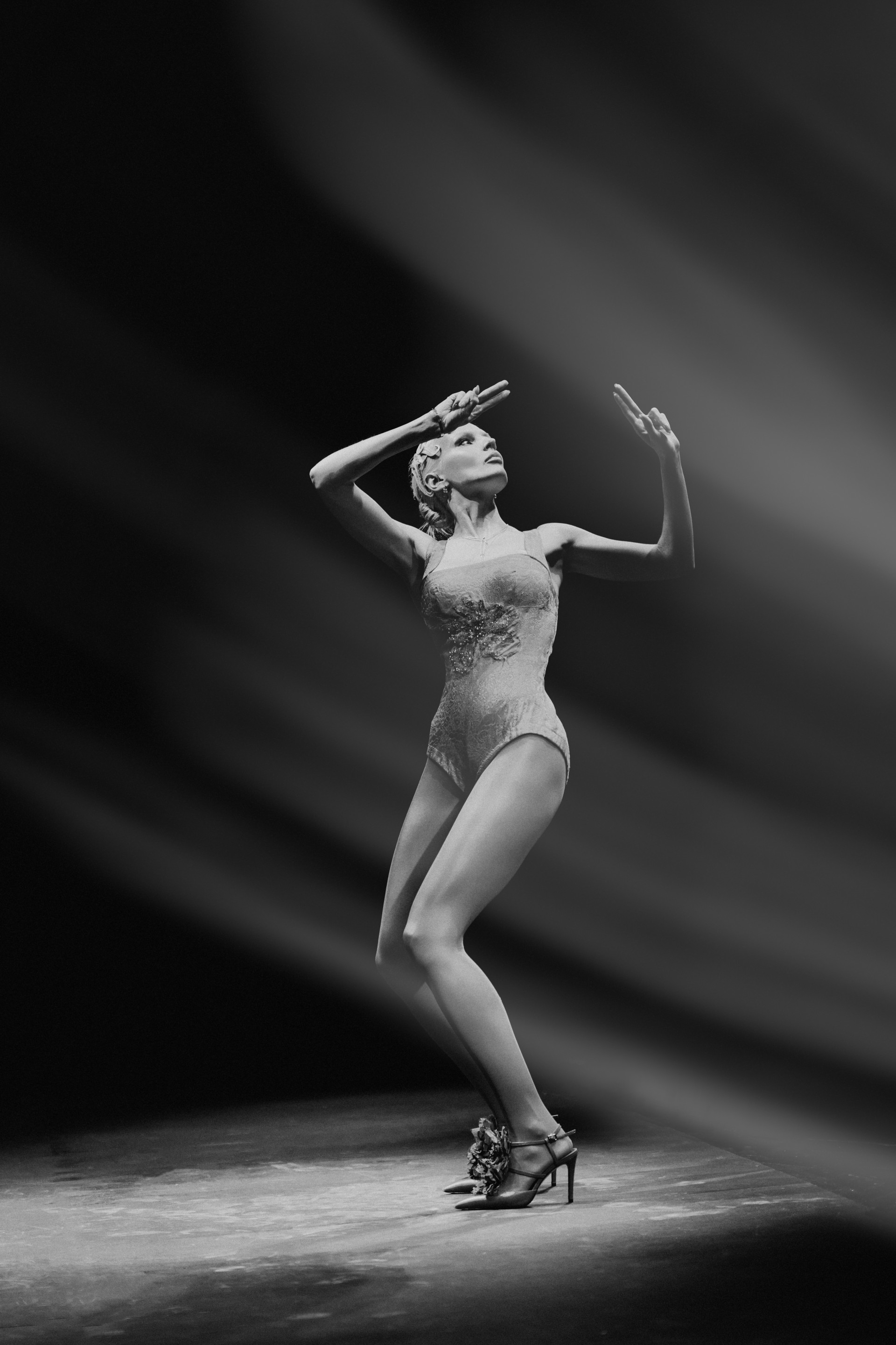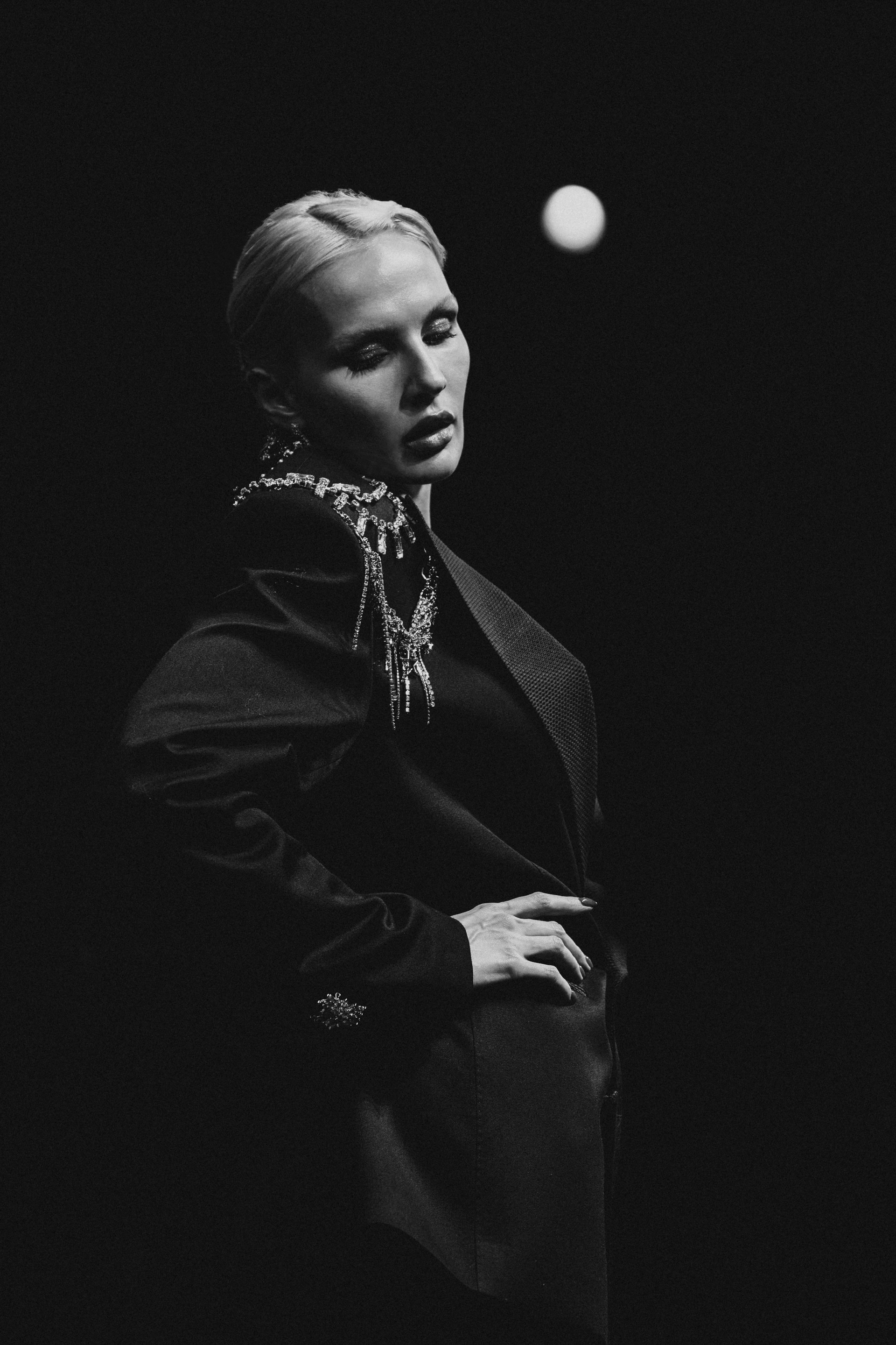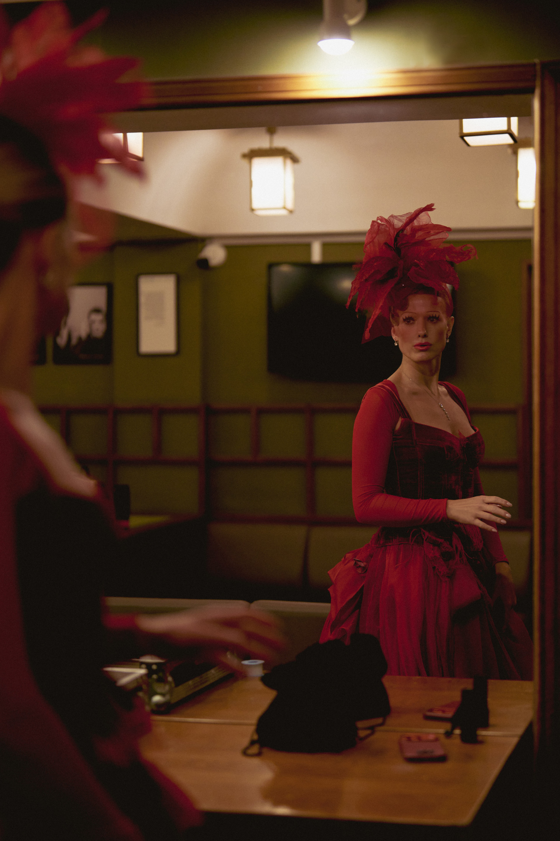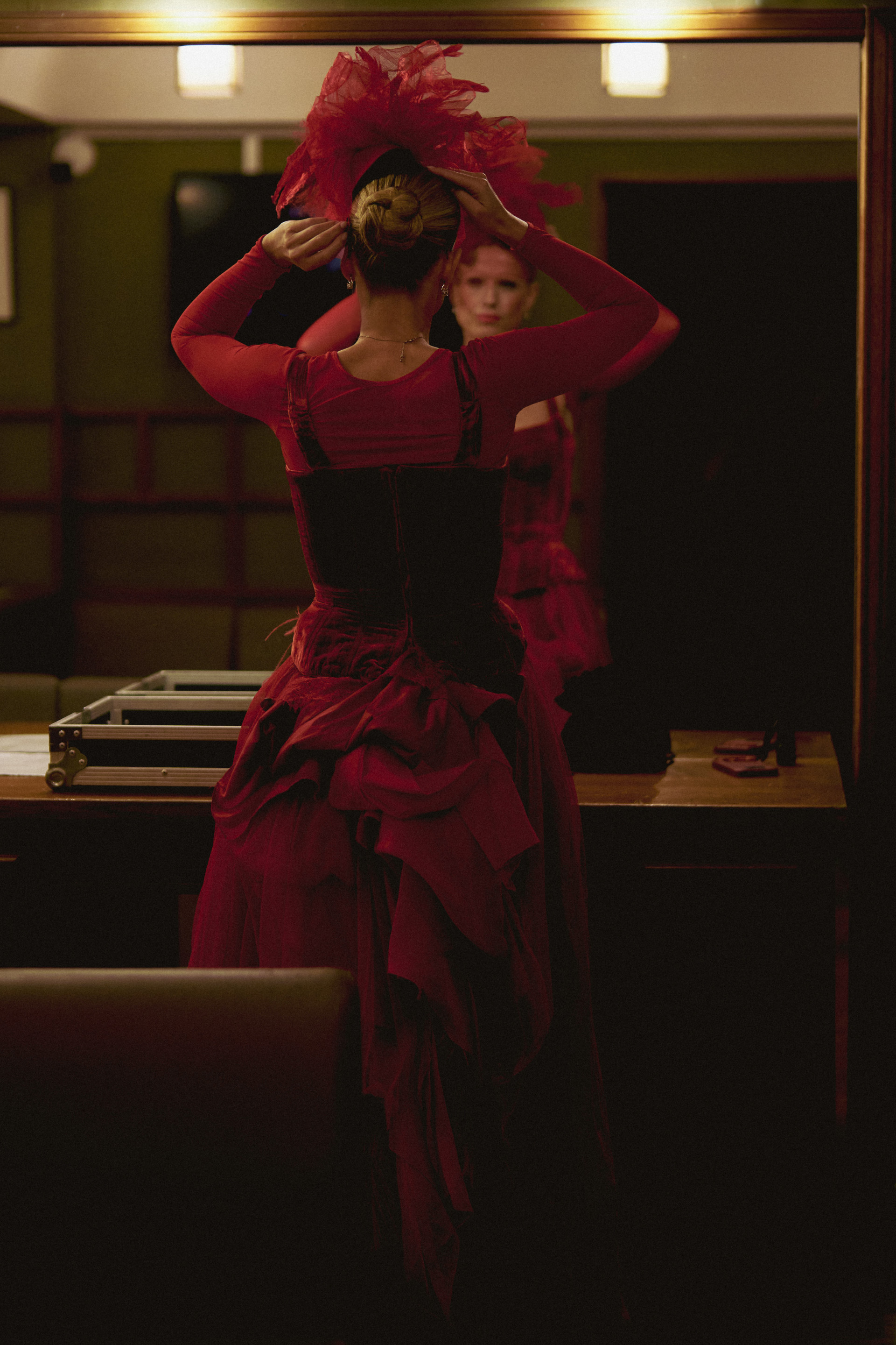 Фотоэссе Алисы Аслановой фиксирует спектакль как особое состояние: мгновения напряжения, застывшие позы, блеск украшений, острые линии тел в движении. Это не просто хроника, а визуальный комментарий к постановке, где театр продолжает жить за пределами сцены — в кадре, в деталях, в отражениях света.