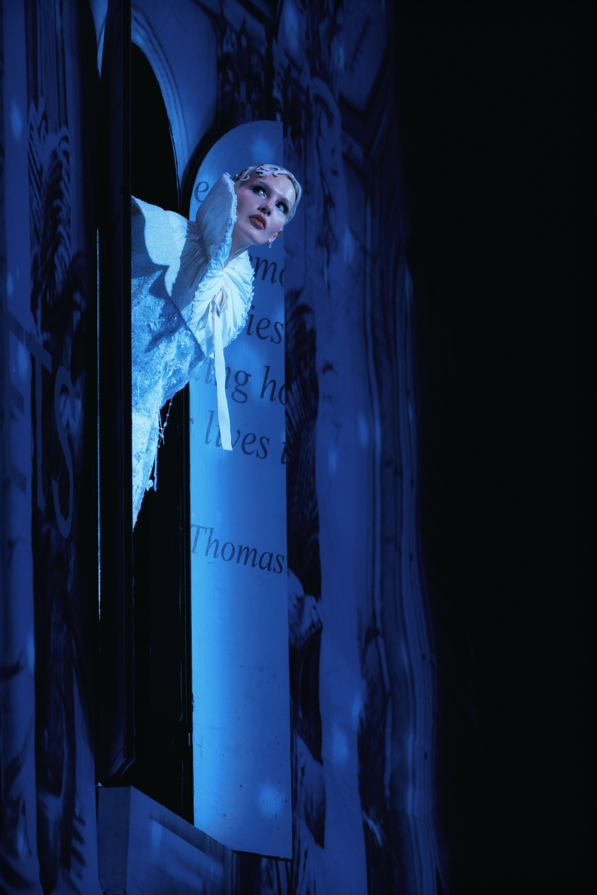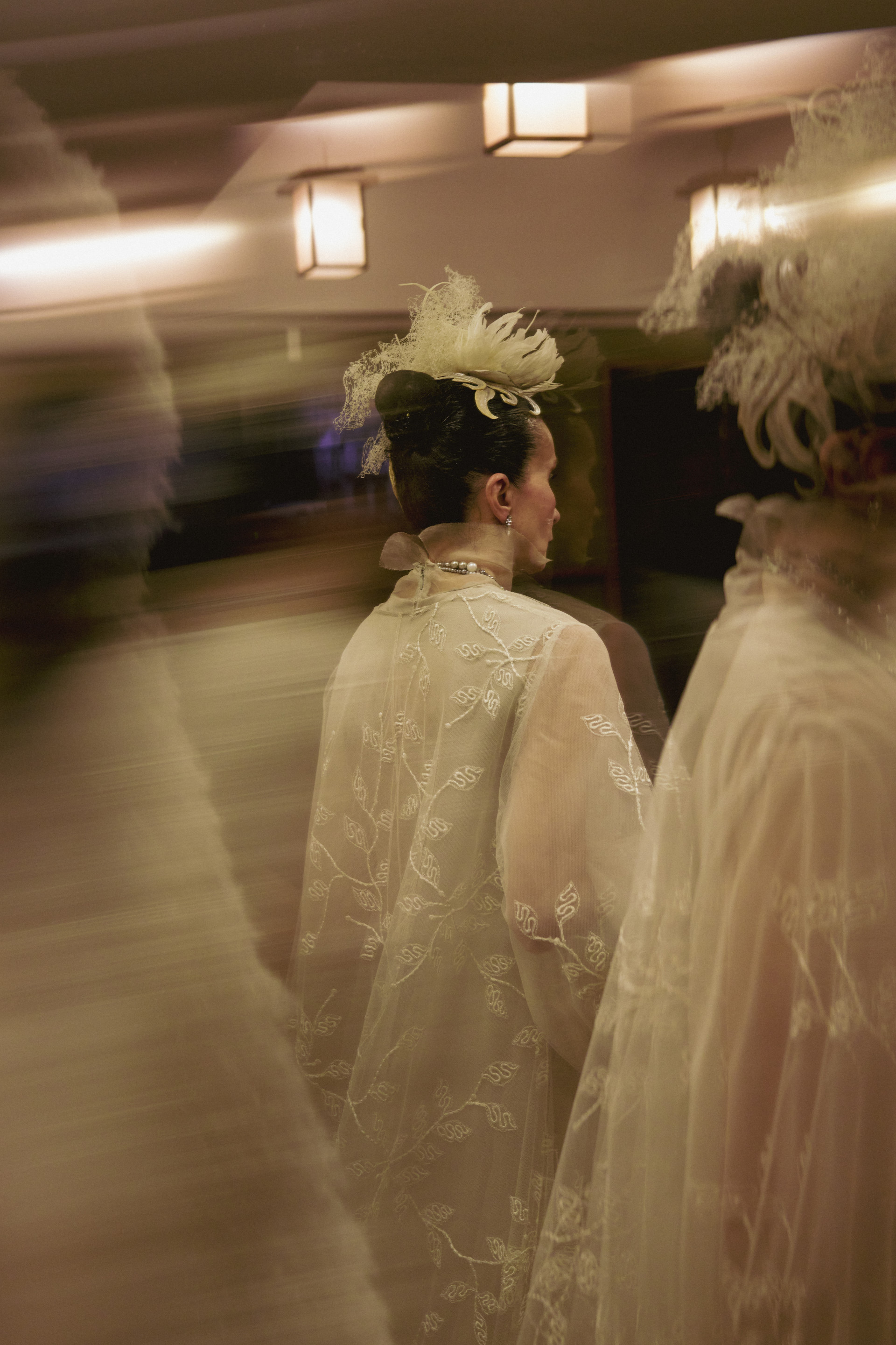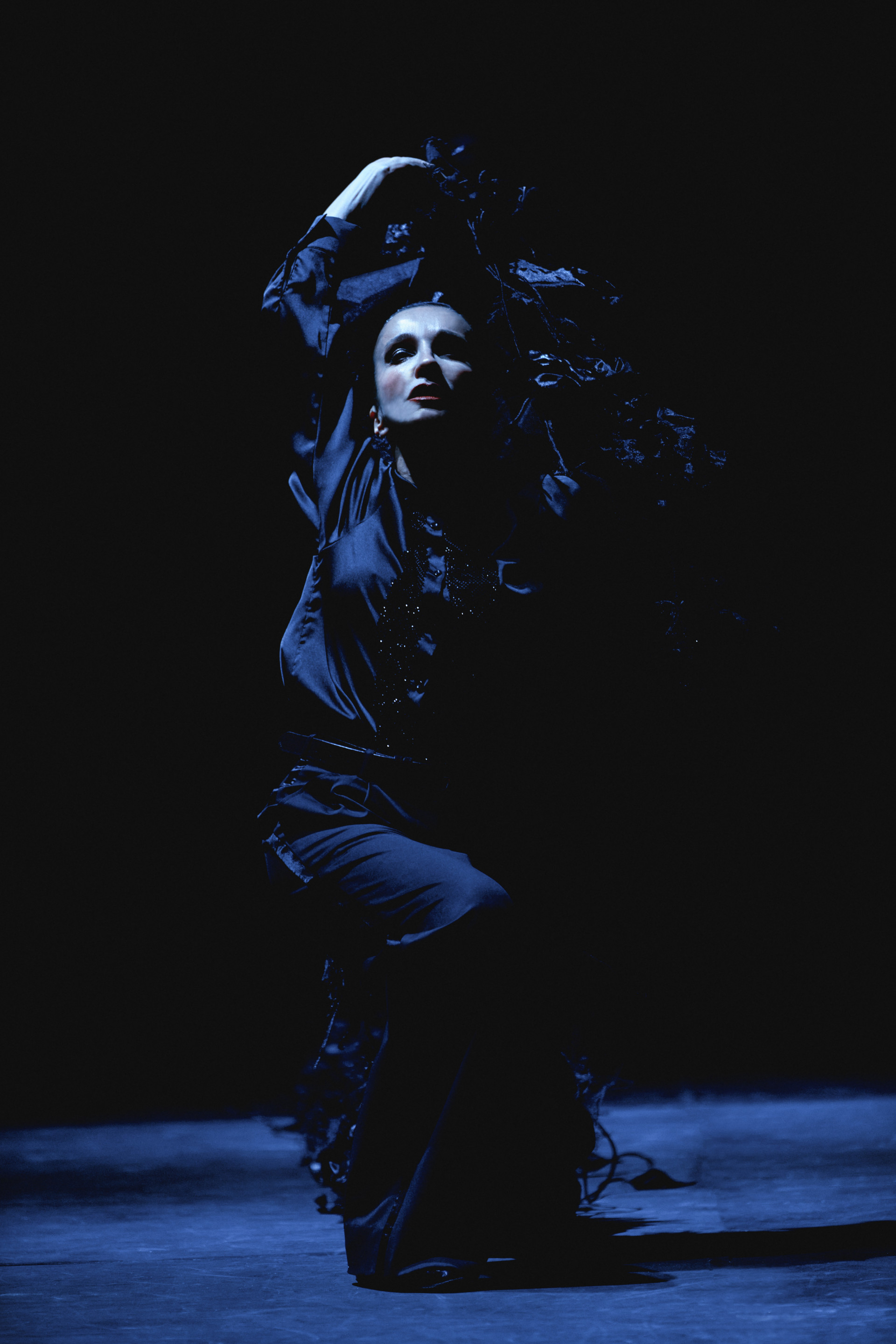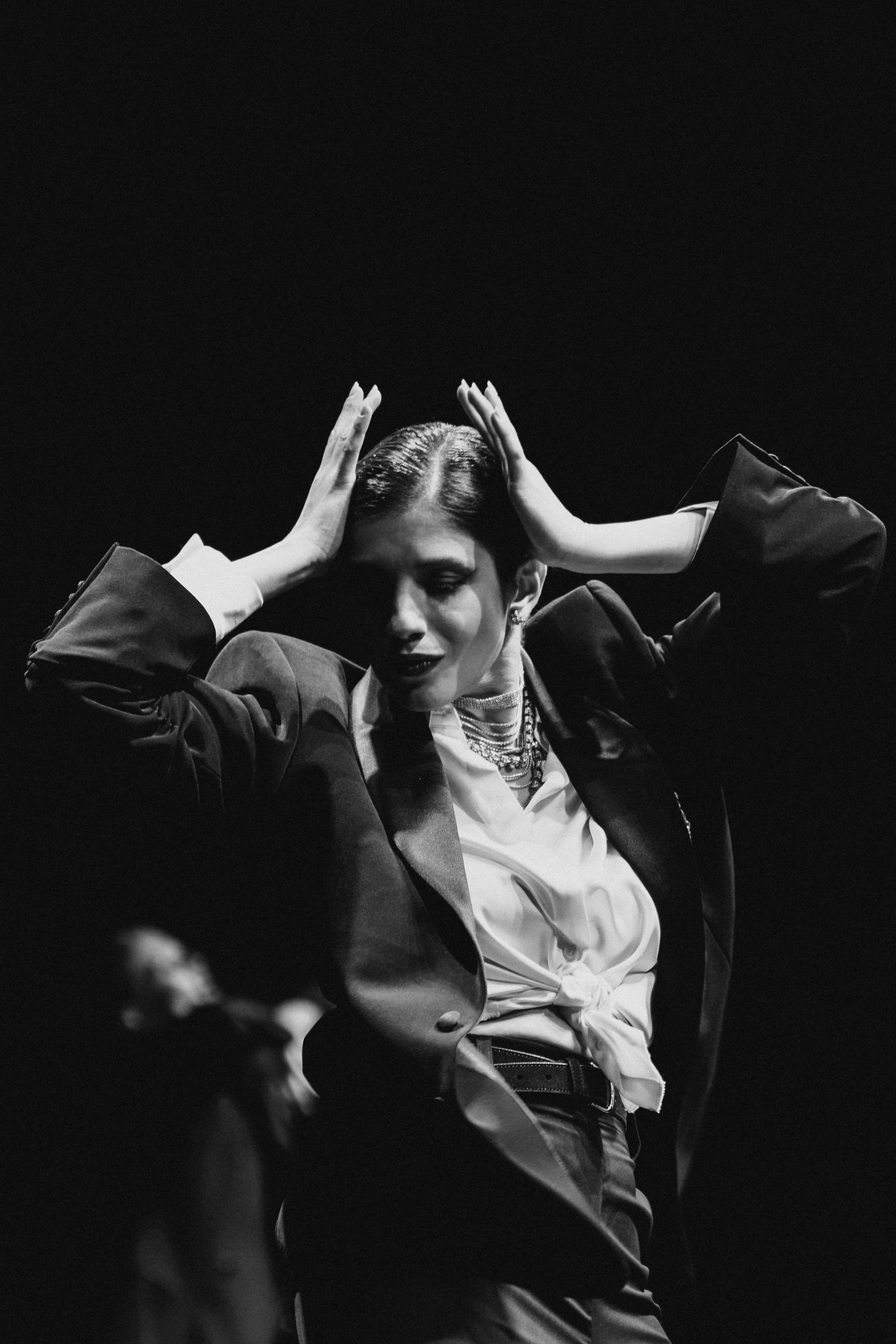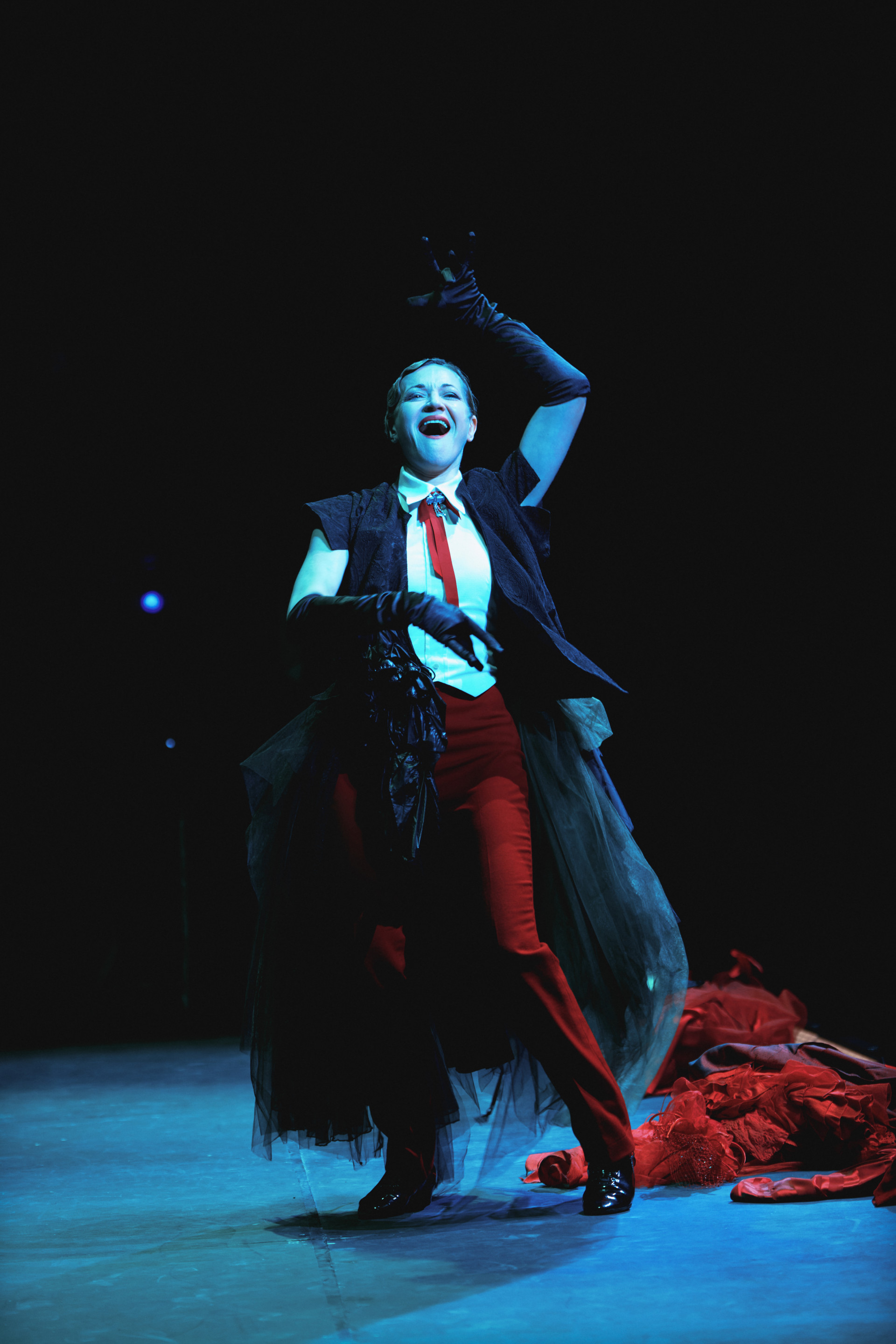 Фотоэссе Алисы Аслановой фиксирует спектакль как особое состояние: мгновения напряжения, застывшие позы, блеск украшений, острые линии тел в движении. Это не просто хроника, а визуальный комментарий к постановке, где театр продолжает жить за пределами сцены — в кадре, в деталях, в отражениях света.